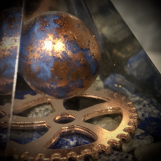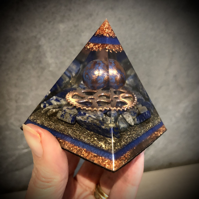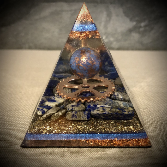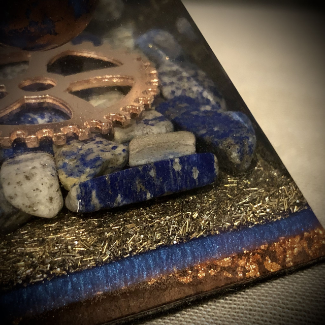 Made from resin, this stunning pyramid encases the fabulous Lapis Lazuli gemstone, one of the most sort out gemstones for any collector. Helping to balance the throat, third eye and crown chakras, Lapis Lazuli also represents Sagittarius zodiac sign. For more information on the properties and benefits of Lapis, feel free to refer to the Crystals/Gemstone section located on the menu bar here on my website. Copper leaf is encased at the tip of the pyramid and runs through the layering. A blue sphere embellished with copper gilding wax is featured as if floating above a copper metallic cog. Metal shavings and blue mica powder have also been incorporated and finishing off the design is a velvet underneath to protect any surface it is placed.