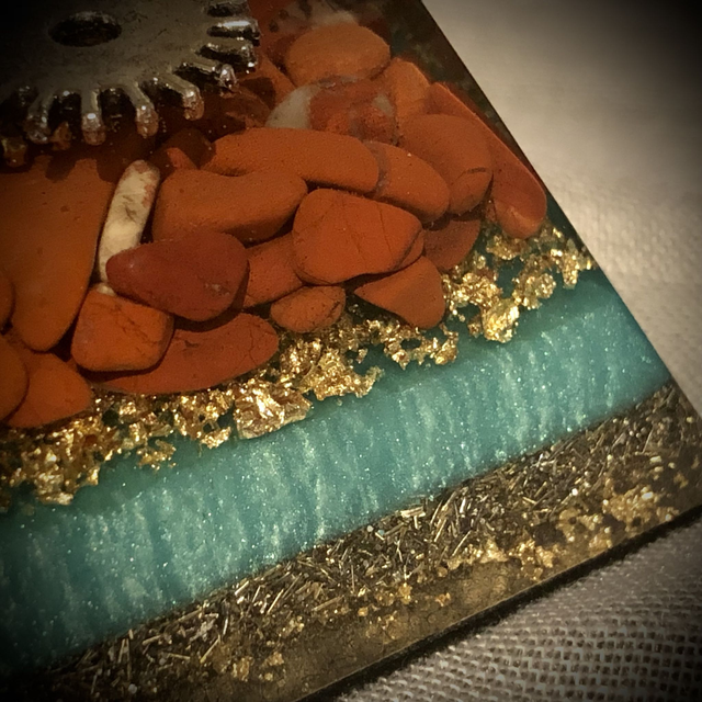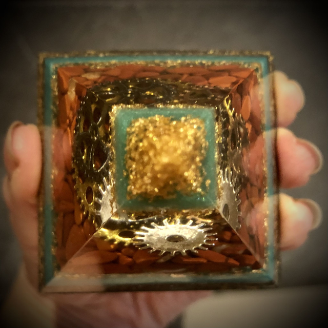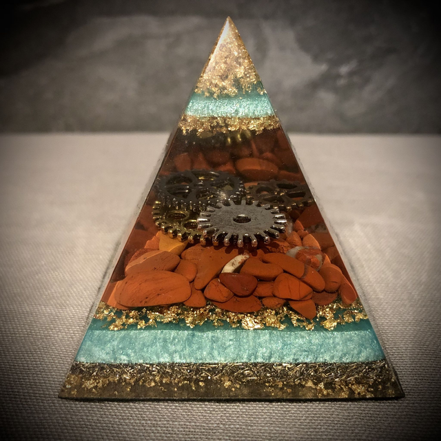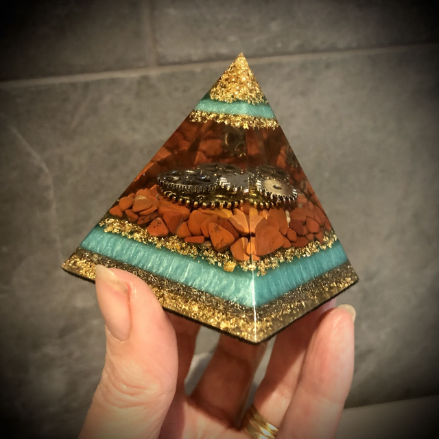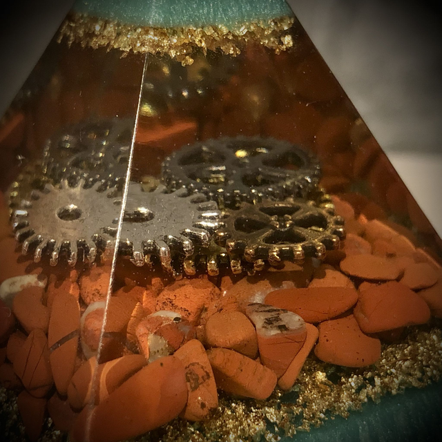 This stunning pyramid is made from resin and encases Red Jasper gemstones. Gold leaf, metal shavings and a vibrant mint green mica powder have been incorporated and not to forget, the metal cogs. I use metal cogs in my designs to represent precious moments in time as they are used in clocks/timepieces so this would make a fabulous gift for someone special. Measuring 6cm in height and across the base, this lovely piece is finished with a velvet underneath. A perfect gift for a steampunk enthusiast or for someone who would benefit from the amazing energies Red Jasper radiates. For more information on the stones encased in this pyramid, feel free to view the Crystals/Gemstones information available on the menu bar here on my website. Simply gorgeous!
