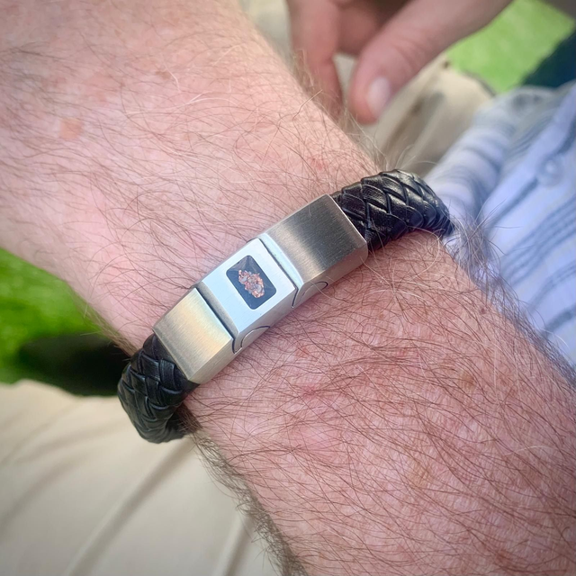 This handcrafted Black Leather Memorial Bracelet is a meaningful way to keep the memory of a loved one or cherished pet close. Each bespoke piece is carefully created to encase ashes or hair, gently preserved within the design.