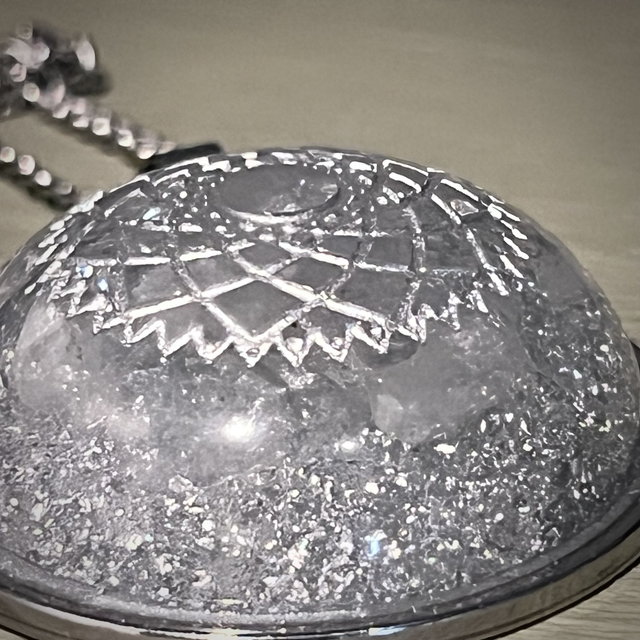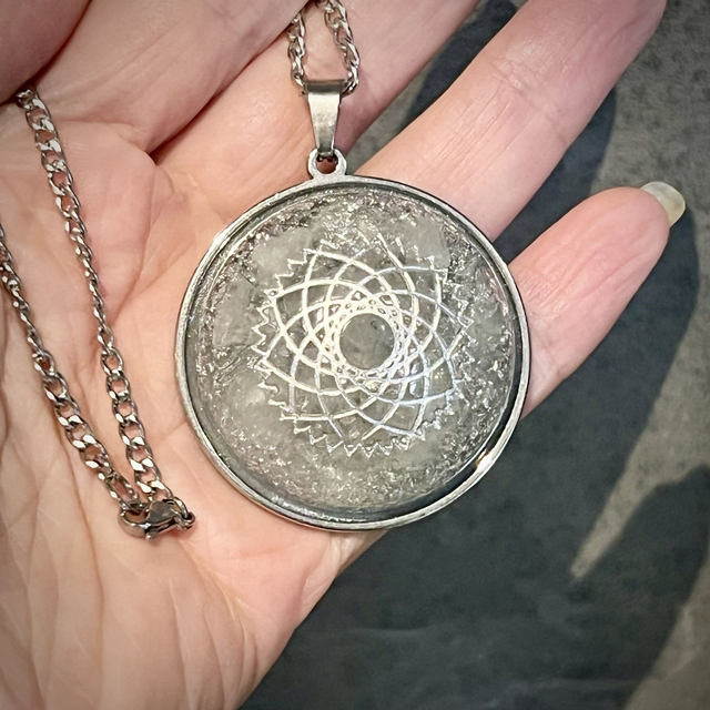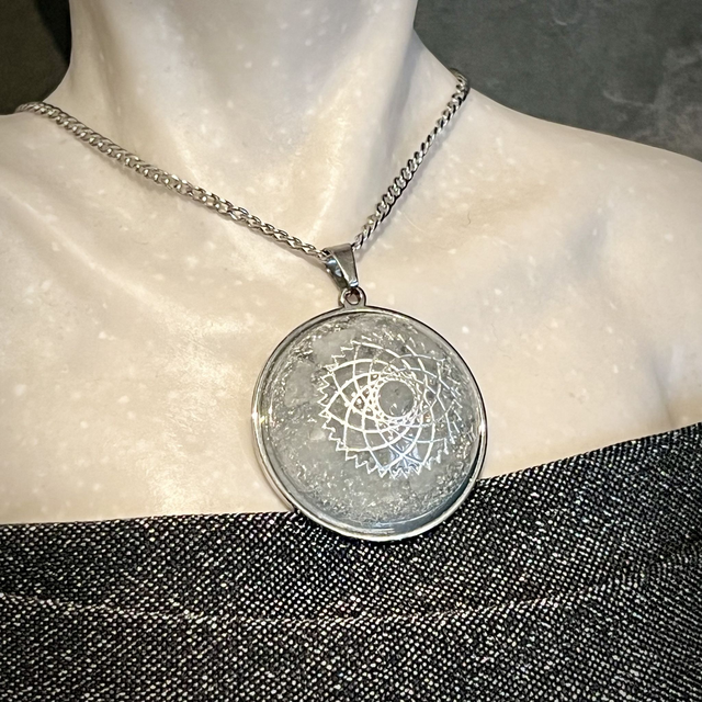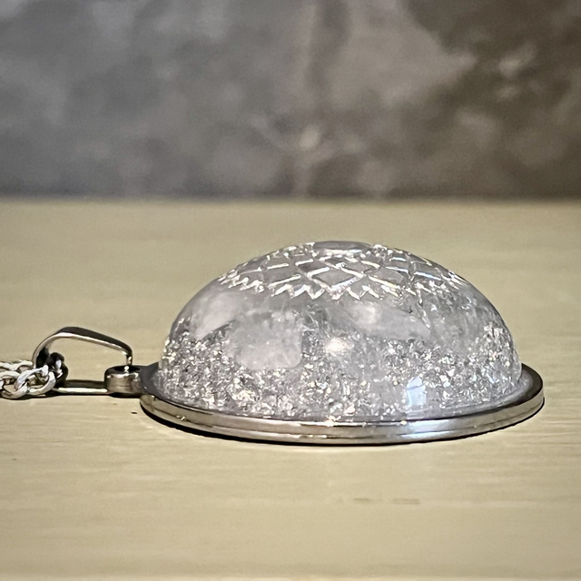 Symbolising the Crown Chakra, this beautiful design encases Clear Quartz crystals, a perfect stone to help stabilise the Crown Chakra! Encased in resin, Clear Quartz chip crystals lie on a bed of silver leaf which catch the light beautifully (for more information on the properties and benefits of Clear Quartz, please refer to the Crystals/Gemstones on the menu bar here on my website). To add more depth to the piece, I added a silver white mica to the pendant tray before attaching the cabochon.