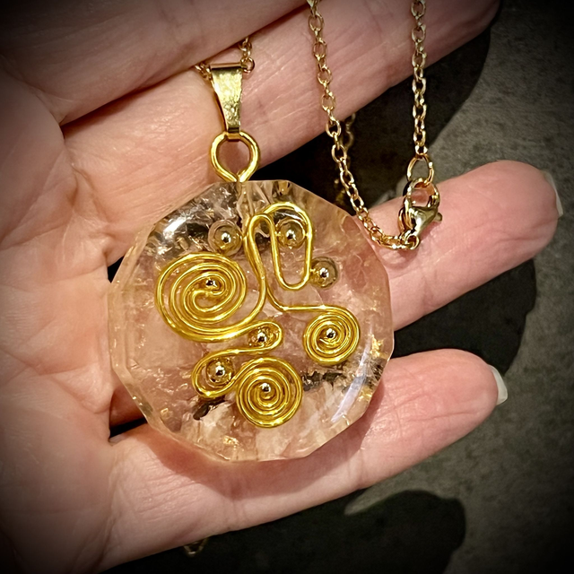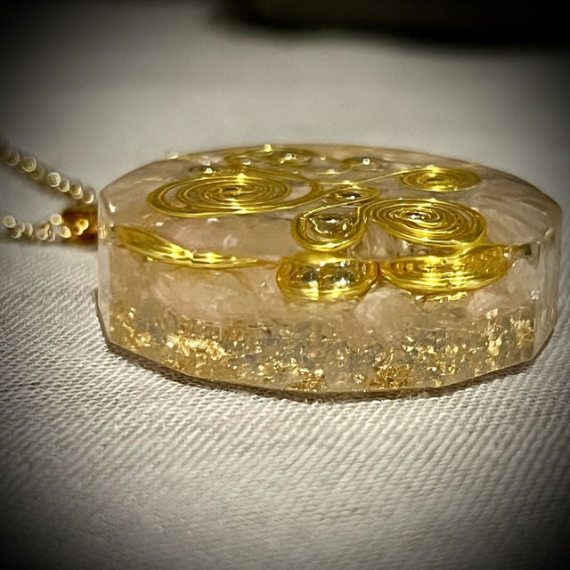 I absolutely love this piece... made from resin, this magnificent pendant encases Rose Quartz chip crystals and features gold coloured metallic ball bearings, gold polished copper wire feature and is finished with tiny pieces of gold leaf at the back of the pendant.