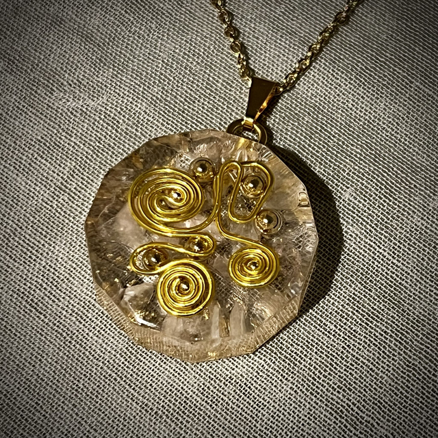 This stunning design is certainly an eye catcher and very unique in design. Also included is an 18 inch 18ct gold plated (on brass) chain with lobster claw fastening, bail and attachments. The disc has 12 sides, measures 35mm in diameter and is 10mm deep.
