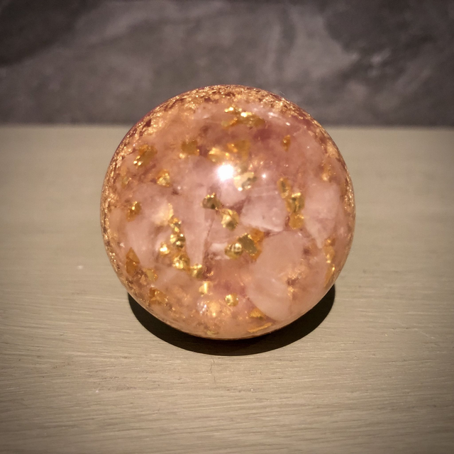 Gently combined with gold crush, the Rose Quartz lie on a bed of gold leaf followed by layers of metal shavings pink mica and another deeper layer of gold leaf and glitter.