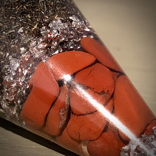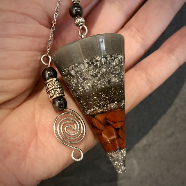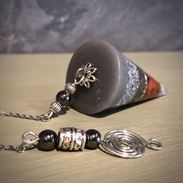 Made from resin, this gorgeous Cone Pendulum encases Red Jasper gemstones and what amazing energies this piece radiates! With silver leaf, silver glitter, aluminium powder and metal shavings running through the layering, it is finished beautifully with Tibetan style beading and attachment with Hematite beads to add grounding and protection to the user. A copper coil plated with silver enamel is also featured not only as a decorative element but more importantly to help balance the pendulum when it is being used. The length of the pendulum is just over 5cm and 3cm at it's widest. The stainless steel chain with embellishments approximately measure 23cm. The whole piece measuring approximately 28cm. An absolute gorgeous divination tool. For information on Red Jasper gemstones and Hematite, feel free to email me at odonatacrystals@gmail.com