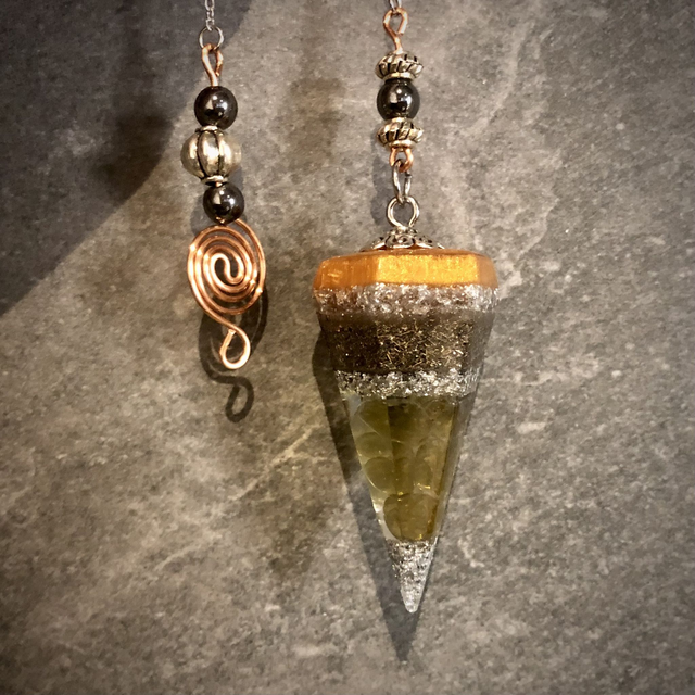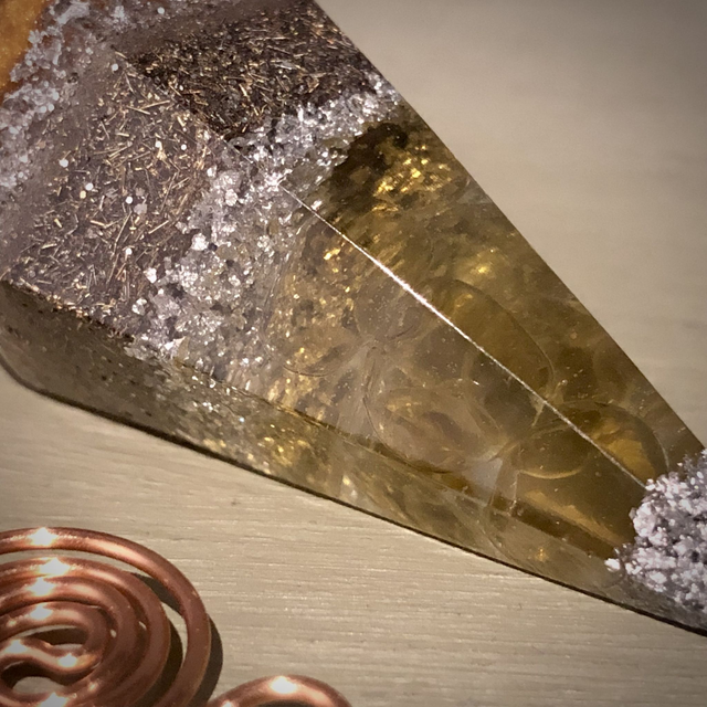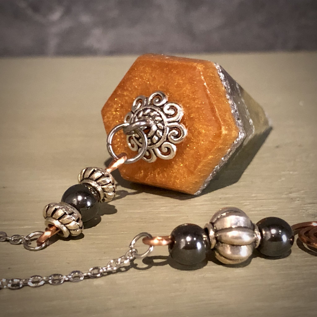Made from resin, this stunning Hexagonal Pendulum encases one of my favourite gemstones, Amber.