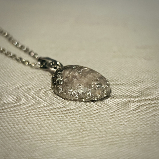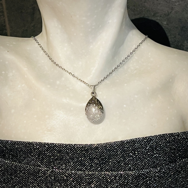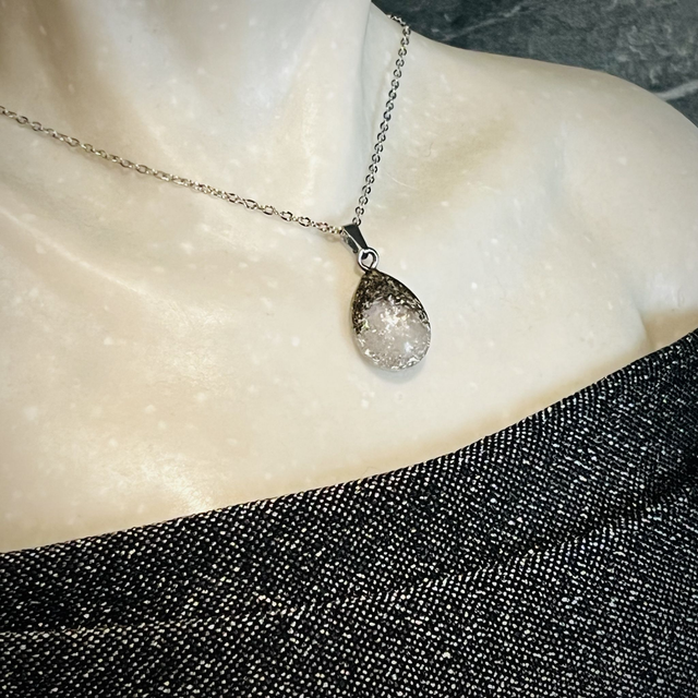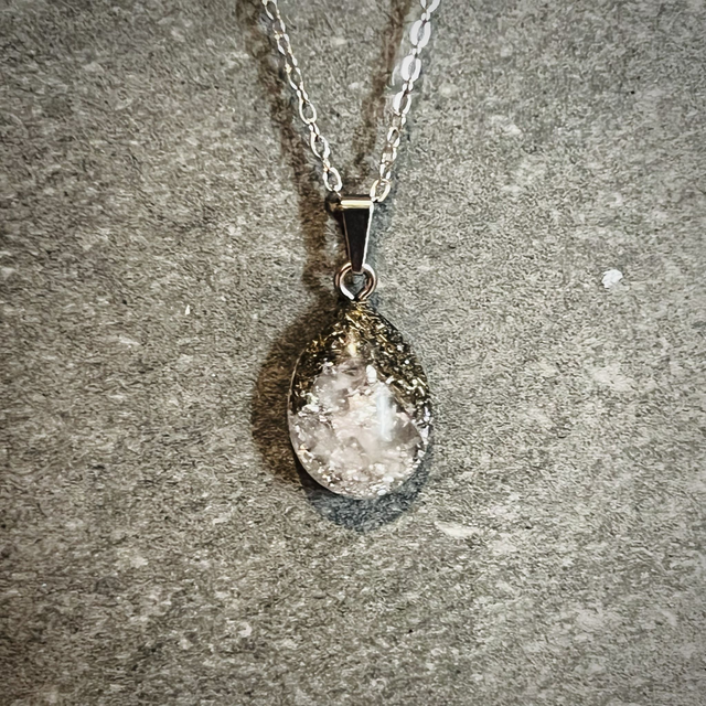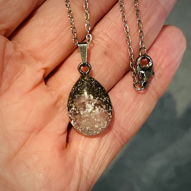 So dainty...this stunning resin Crystal Energy Teardrop Pendant encases a tiny cluster of Rose Quartz crystals along with silver leaf towards the base of the teardrop. In the upper part I have incorporated metal shavings which glisten beautifully. And to finish off the design silver metallic leaf is presented at the back of the teardrop. Perfect for Taurus and Libra Zodiac signs, those who love the energies of Rose Quartz and anyone who wishes to take advantage of the properties and benefits of these amazing stones, this is for you! I just love the subtle hue of pink! The drop measures approximately 2cm in length, 1.3cm width and 8mm deep. It is attached to a stainless steel snap bail and comes with an18 inch stainless steel chain with lobster claw fastening. For more information on these amazing crystals, please feel free to view the Crystals/Gemstone section via the menu tab here on my website. It's certainly an eye catcher!