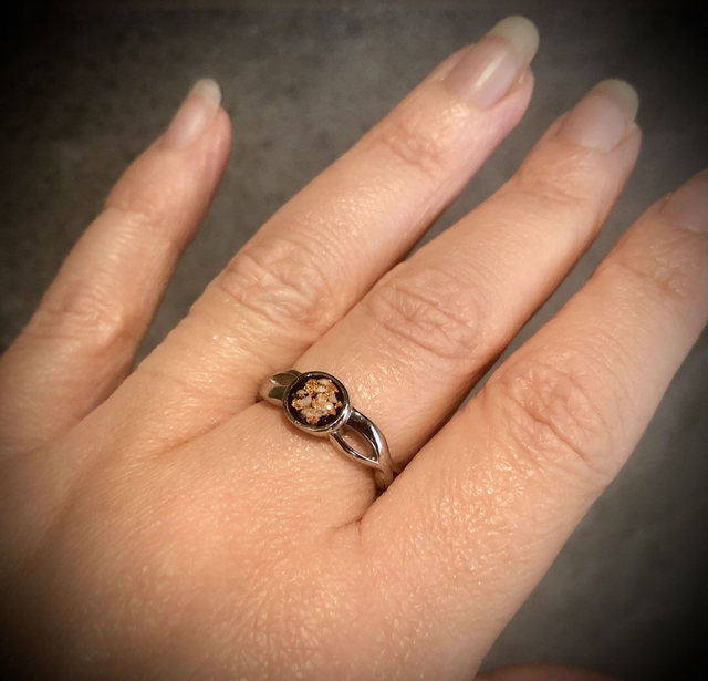 Each piece is completely bespoke. We will work together to design a ring that tells your story, with colour choices, mica powders, metallic leaf, and thoughtful ways of presenting the ashes or hair. Simply email odonatacrystals@gmail.com to begin your design consultation and ordering process.