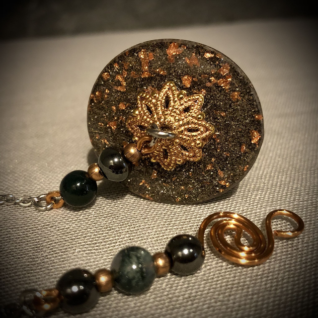 This fabulous Orgonite encases Clear Quartz, Green Agate, Copper leaf, copper powder, metal shavings, copper coated steel ball bearings with a copper wire Triskelion symbol cut and halved the sacred cubit length and buried deep in the mix of the upper layer of metal shavings - all the necessary ingredients to create a powerful Orgonite. Incorporated into the design of the chain are Hematite and Moss Agate beading, copper coloured metallic micro beads and copper wire links with a gilded copper metallic attachment . The Orgonite cone measures approximately 5.5cm in length and 3cm in diameter at it's widest and hangs from a 17.5cm embellished chain.