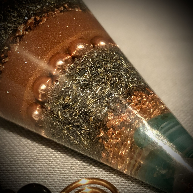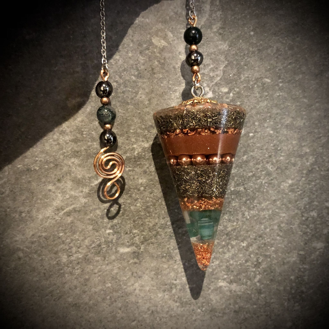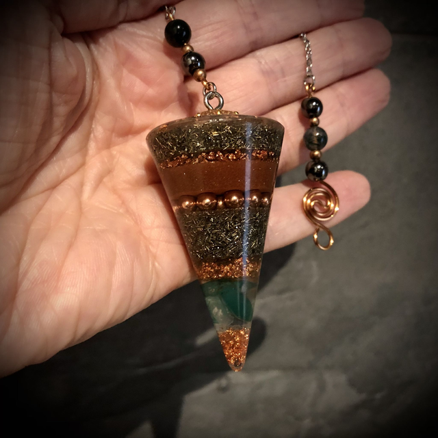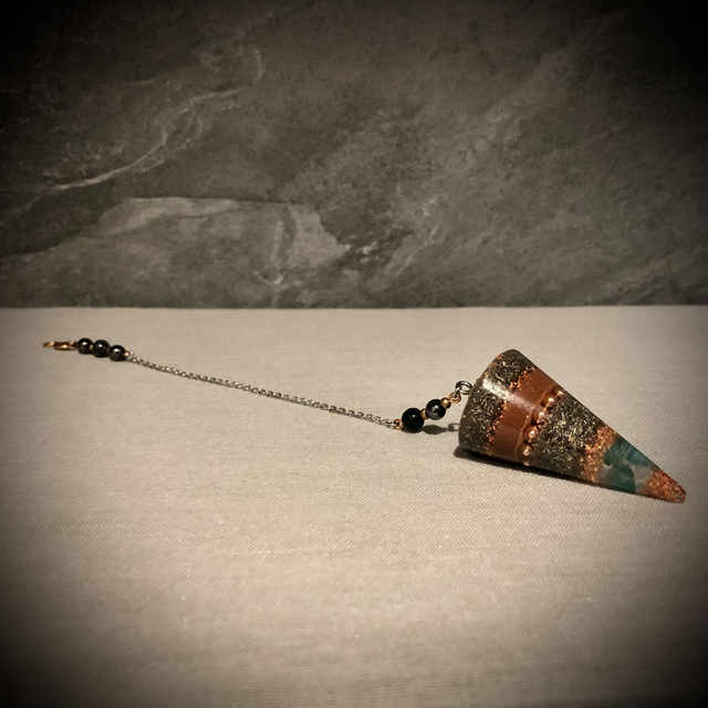 Orgonite Cone Pendulum with Clear Quartz, Green Agate and copper powder