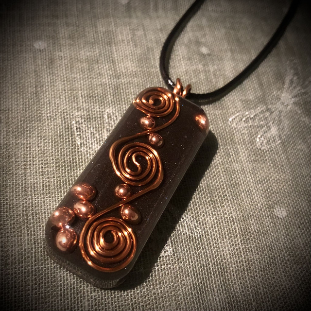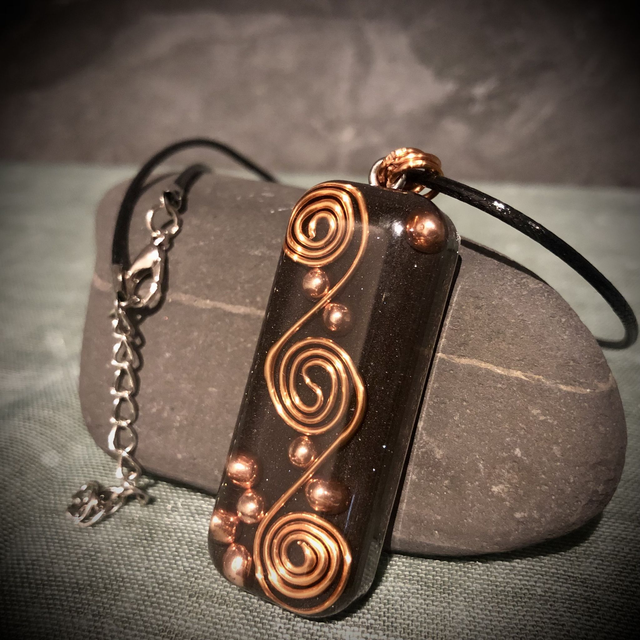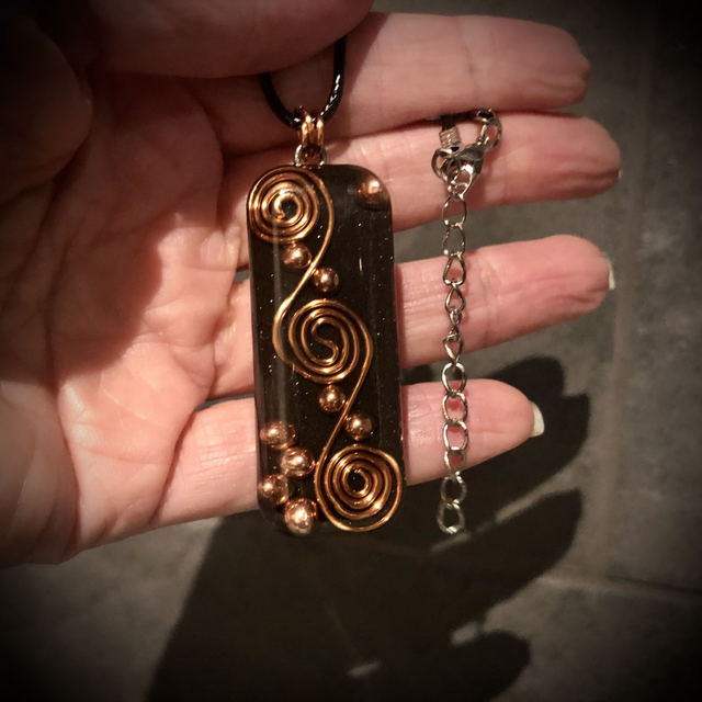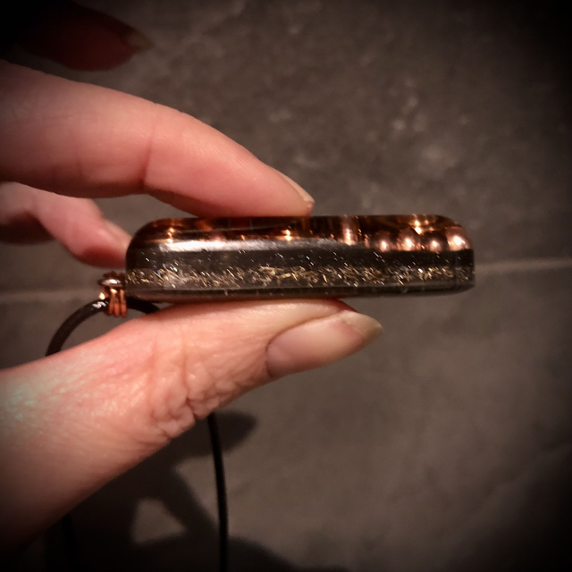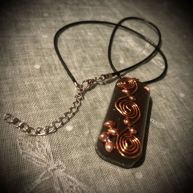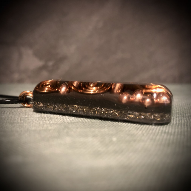An authentically made Orgonite created with all the necessary ingredients for a powerful orgone devise. Elegantly designed with a copper wire wrapped triple spiral, added not only as a decorative feature but more importantly as a conduit, circulating the flow of energy. Mini copper spheres lying on a bed of iron powder and metal shavings are also incorporated with Clear Quartz crystals buried deep in the mix. This fabulous design is oblong in shape and measures approximately 5cm in length, 2cm in width and 12mm deep. It is attached by 3 copper jump rings in keeping with the copper vibe to a 17 inch black wax coated cotton cord with a 2 inch silver metallic extender chain and lobster claw fastening.