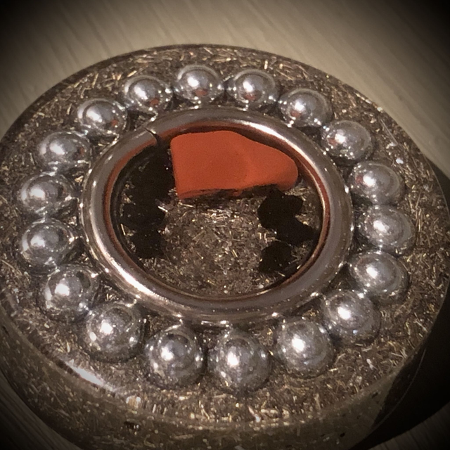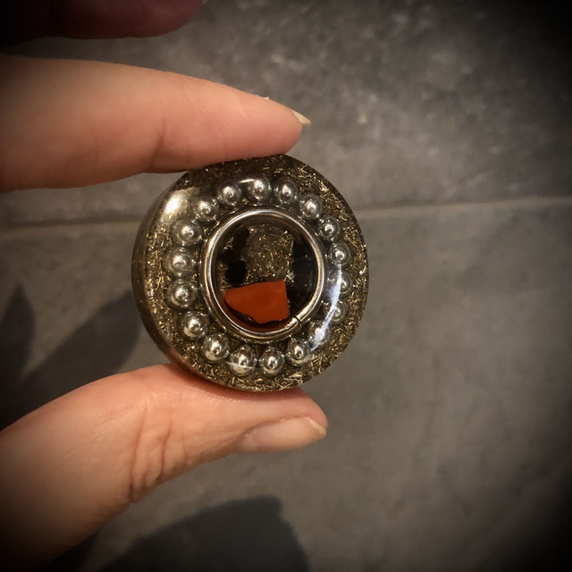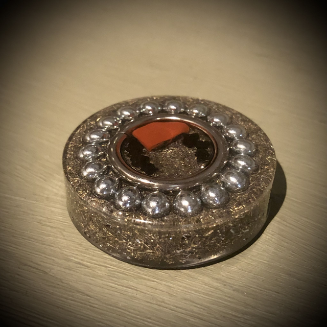 Authentically made pocket orgonite, encasing Clear Quartz crystals, Red Jasper, Black Tourmaline, metal shavings, metal ring, and stainless steel ball bearings. This amazing piece also features a silver polished copper spiral Triskelion symbol on the other side which is cut and halved the sacred cubit length.