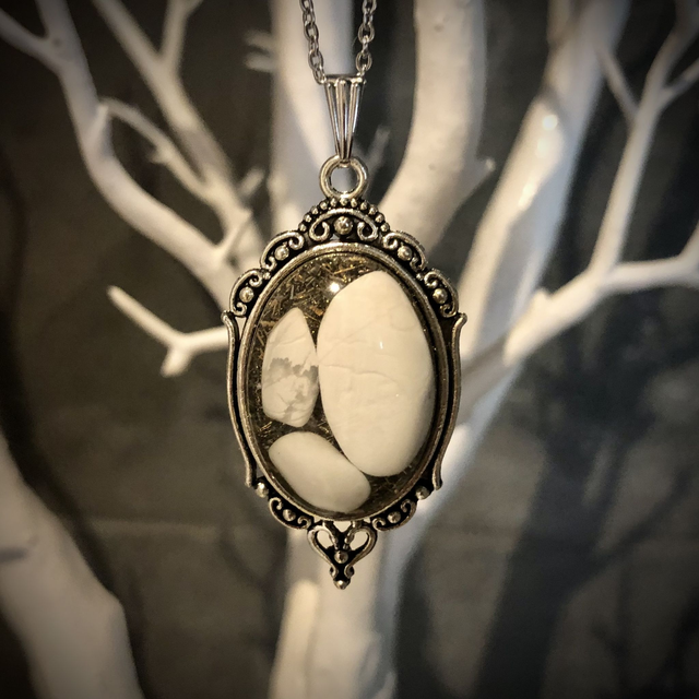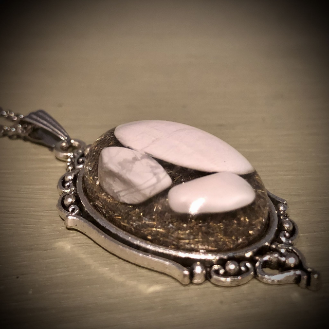 A cluster of 3 White Howlite gemstones encased in resin lying on a bed of metal shavings. I love the look of these stones too with the grey/black vain running through the gleaming white. It almost illuminates so will definitely turn heads!